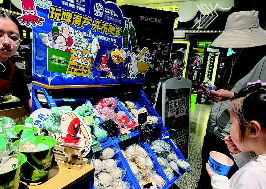 “目前蛏子、鲅鱼、海蛎子和啤酒销售都不错,售罄两次了,还在持续补货中。海鲜摊位也给市民游客带来一种室内赶海的玩法。”修雪皎称,接下来还会推出第二批海鲜类玩偶,玩偶在目前的基础上有所升级,或将推出超大号或者可互动的玩具。“我们在设计过程中,也会融合自己的生活工作状态,在形象化设计的同时,把我们思考的青岛特色传达出来。”