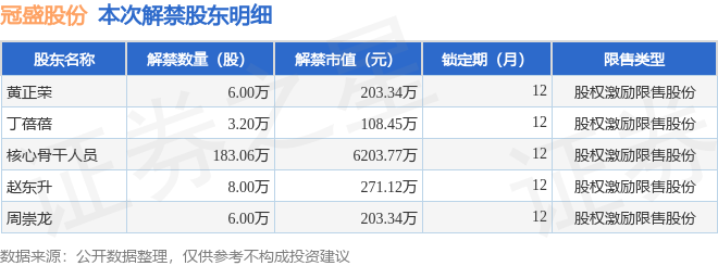 证券之星消息,根据市场公开信息整理,冠盛股份(605088)于6月27日将有206.26万股限售股份解禁,为公司股权激励限售股份,占公司总股本1.11%。(本次数据根据历史公告整理得出,实际情况以上市公司最新公告为准)本次解禁后,公司还有310.34万股限售股份,占总股本1.67%。具体如下图所示: