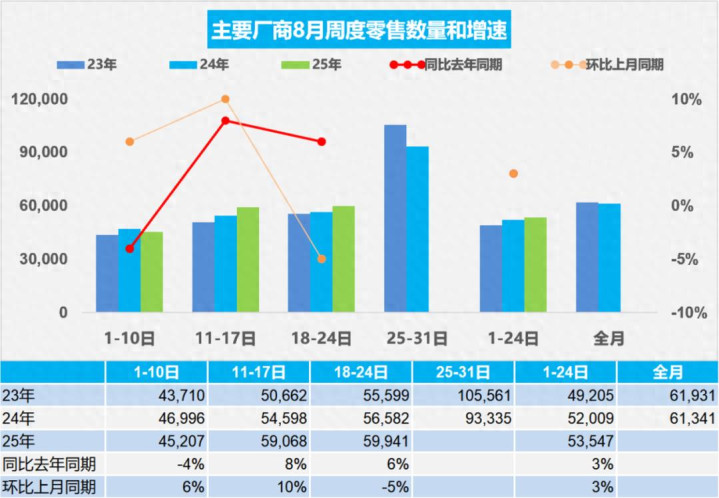 乘联分会表示,近期各地车市的促销刺激政策推进较稳,今年7月下旬第三批补贴资金已经下发各地,部分地区的以旧换新逐步重启,补贴方式也更加多元化,有望改善8月的增速。但由于去年7月“以旧换新”政策加码补贴效果良好,消费热情迅速激发,因此今年8月的销量基数相对较高,8月前期的零售增速已经体现增长偏弱的压力,8月中下旬车市逐步回暖。